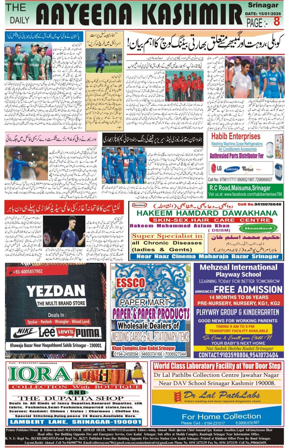 E PAPER DAILY AAYEENA KMR. Page: 8 January 15, 2026 << First << 8 >> Last >> Page 1Page 2Page 3Page 4Page 5Page 6Page 7Page 8 × E PAPER DAILY AAYEENA KMR. << First << 8 >> Last >> 12345678